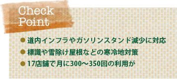 厳しい寒冷期にも大きなクレームはなく、順調に運用。地方のガソリンスタンド減少などを補うインフラとして期待されている。