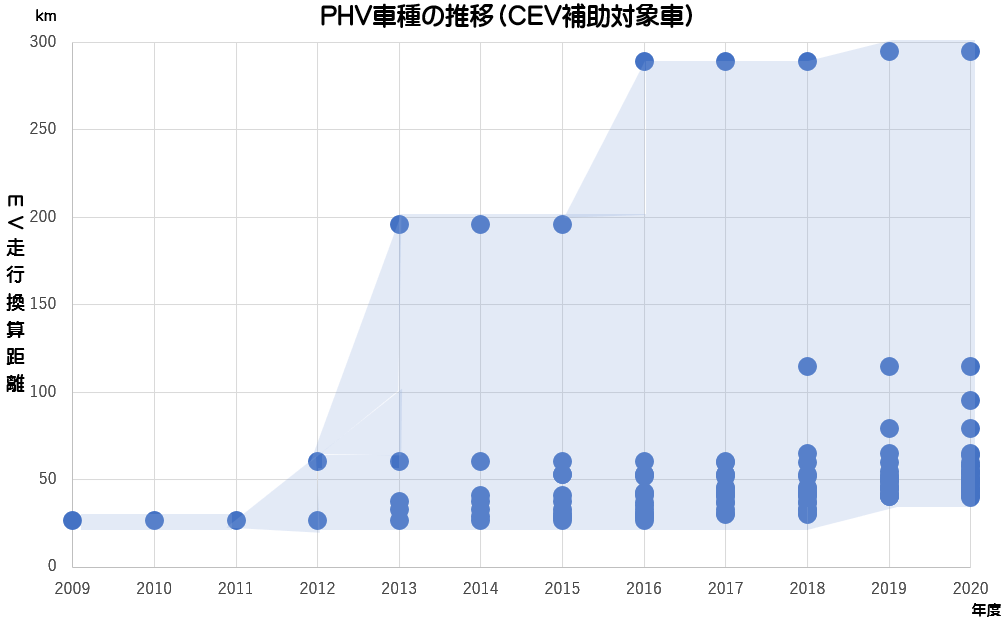 補助対象PHVの車種数と、EV走行換算距離を表したグラフ。